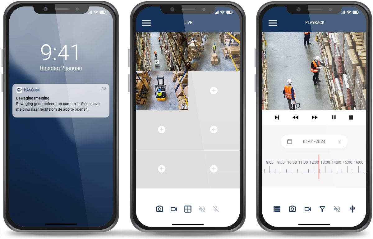 Met de smartphoneapp van Bascom heeft u overal ter wereld toegang tot uw camerabeelden. De app is eenvoudig in gebruik: u scant de QR-code op de recorder en bent direct verbonden. Vervolgens kunt u de livebeelden bekijken, opnames raadplegen en back-ups maken. De app biedt ondersteuning voor meerdere camerasystemen, waardoor u deze in één overzicht kunt beheren.